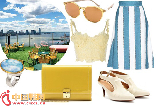 要想穿出俏皮活力又帶點(diǎn)文藝復(fù)古范兒,可以試試短打上衣搭配高腰傘狀半裙的穿法。Ermanno Scervino這款鵝黃色蕾絲短打上衣,性感之余還透著一股清新,搭配Dolce & Gabbana藍(lán)白條紋及膝中裙,夏日氣息撲面而來!一款Balenciaga米色鏤空涼鞋和Marc Jacobs芥末黃手袋,增加不少優(yōu)雅感。如此一套,再戴上Materia Prima藍(lán)天白云的戒指,和Linda Farrow x The Row合作款圓形墨鏡,上屋頂酒吧盡情享受陽光的洗禮吧!