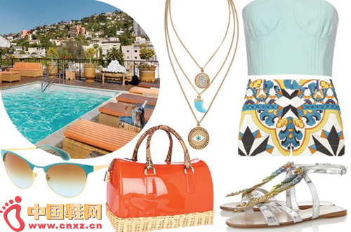 夏天的好處,就是可以短,短,再短!特別是陽光明媚的洛杉磯,不短對(duì)不起好天氣。泳池派對(duì)加上屋頂酒吧,當(dāng)然是要性感清涼起來,首選Christopher Kane的淡藍(lán)抹胸短打,搭配Philosophy西西里印花風(fēng)格短褲,營(yíng)造清涼氛圍。平底羅馬鞋就以足矣,Miu Miu的銀色涼鞋華麗非常,和印花短褲相得益彰。最后配飾上,F(xiàn)urla的透明糖果手袋大家一定再熟悉不過,新款加上編織底,更有夏天的效果。Juicy的三次疊搭項(xiàng)鏈會(huì)讓你的頸前看上去不會(huì)空空如也,最后再戴上Miu Miu墨鏡,完美!