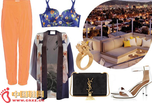 夏天的好處,就是可以把“睡衣”穿出門,波西米亞風(fēng)絕對(duì)是今夏必須嘗試的風(fēng)格之一。Stella McCartney這件短打上衣,也許你會(huì)覺得有點(diǎn)兒“過分”,簡(jiǎn)直就是內(nèi)衣外穿嘛!但是怕什么,披上Athena Procopiou的和服外套就不會(huì)顯得“風(fēng)騷”了。下裝也要搭配艷麗的顏色,Chloe橙色9分褲絕對(duì)夠耀眼。配飾上就不需太過花俏,YSL黑色手包,Givenchy白色短跟涼鞋就可以平衡大面積印花。最后帶上Alexander McQueen骷髏戒指,閃耀全場(chǎng)。