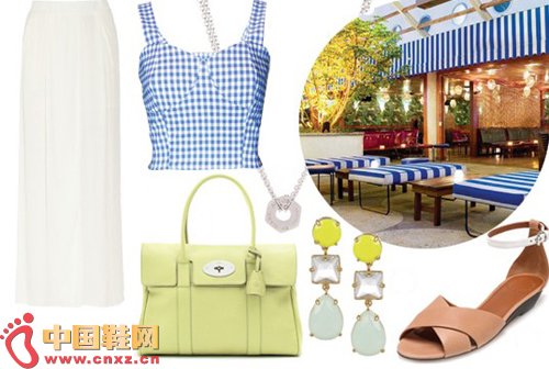 還記得午后紅茶廣告里的赫本嗎?典型的田園風(fēng)格你所需要的就是一件格子上衣,當(dāng)然最好還是粉嫩的顏色,F(xiàn)air+True這件水粉藍(lán)色吊帶短打上衣清涼又清新,搭配上清新界翹楚品牌MAJE的白色長(zhǎng)裙,到腳踝的長(zhǎng)度剛剛好,即使穿著Marc by Marc Jacobs的短跟涼鞋,也不會(huì)顯得腿短。手袋當(dāng)然是要更清新,還有什么比熒光綠色客人,Mulberry的這款Basewater手袋正正好。配飾上選擇J Crew夏天感耳環(huán)和Marc by Marc Jacobs銀項(xiàng)鏈,就足矣了。