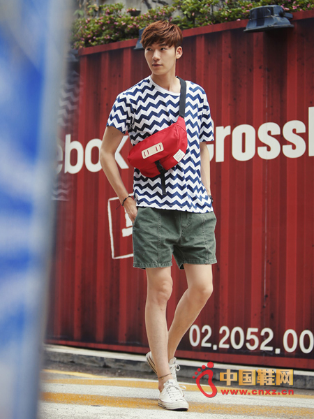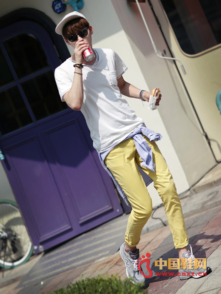 水洗噴漆圖案的V領T恤,局部如同噴漆的圖案,簡單瀟灑。簡單的V領衫,亮色的卷邊長褲和腰間的搭配,增添時尚氣息。