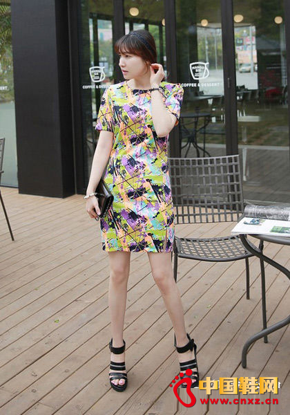 五彩繽紛的油畫印花令皮膚顯得白湛,黑色條紋涼鞋搭配這條斑斕的裙子恰當(dāng)好處,個性又不失女人味。
