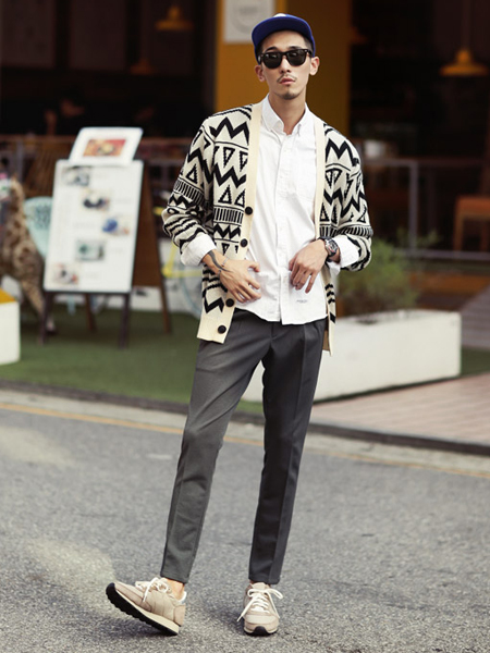 圖案設(shè)計搶眼的開襟衫,簡潔的兩種配色,風(fēng)格時尚,寬松的版型,與修身的和白色襯衫混搭穿,演繹造型休閑的搭配。