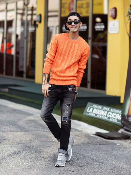 麻花編織圖案圓領(lǐng),粗線條的麻花編織圖案十分清晰,插肩袖的款式,版型自然,搭配復(fù)古的破洞牛仔褲,打造即簡約又個性的裝扮。