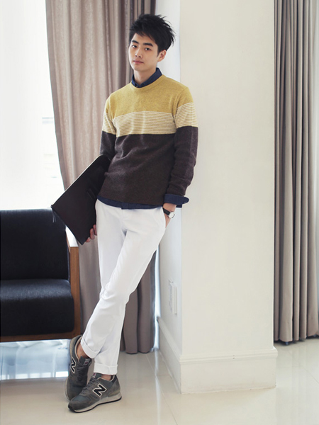 三色拼接的針織衫,簡單的三色,中間一段是條紋圖案配色,優(yōu)雅的魅力,內(nèi)搭立領(lǐng)襯衫,下搭休閑褲裝,穿出休閑風(fēng)格。