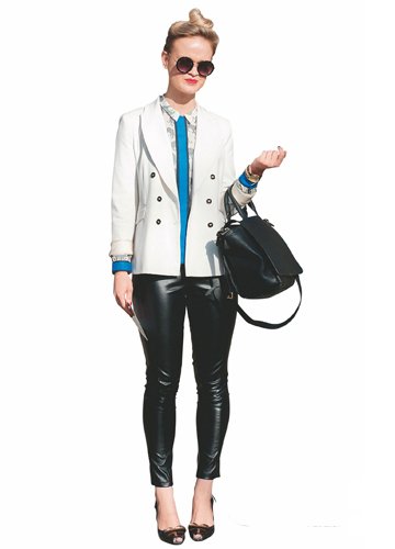 黑色皮褲搭配皮草或者皮夾克帥氣又奢華,輕柔的質(zhì)感與漆皮褲硬朗氣質(zhì)搭配天衣無縫,再加上西服外套,讓你變?yōu)榻诸^的女騎士。