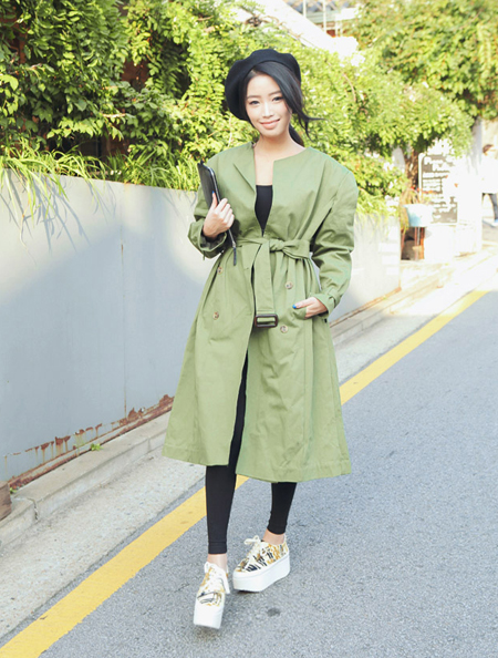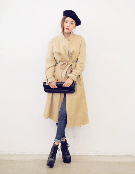 簡單的長版風衣外套,無領的雙排扣設計,寬松的款式,要不有腰帶配置,扎上腰帶,殼顯出腰部線條。
