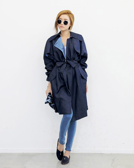 時尚的披風式長款外套,牛仔色的寬松面料,上身隨性又舒適,下搭修身牛仔褲,再系上腰帶,凸顯腰部曲線。