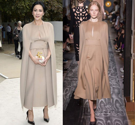法國巴黎,2014巴黎春夏時裝周Valentino專場秀。劉嘉玲裸色披風現身,有股“女王駕到”的氣勢。