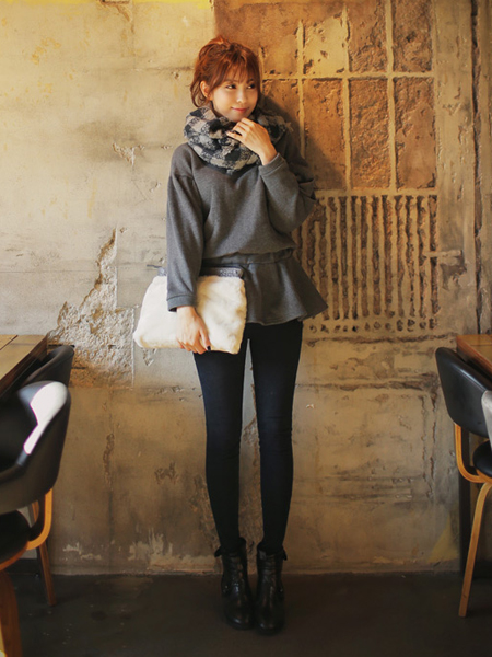 厚實的拉絨衛衣,腰部松緊處理,甜美的荷葉擺設計,給簡單的衛衣加分不少。下搭修身的小腳褲和短靴,展露年輕的感覺。
