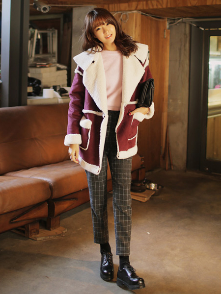 寬版翻毛夾克,長度過臀,寒冷的冬天穿也很暖和,大大的領邊,還有顯臉小的效果。粉色的針織衫和格紋休閑褲搭配,展現休閑又有沉重感的風格。