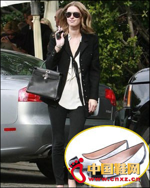 黑色牛毛皮豹紋尖頭蝴蝶結(jié)平跟鞋,鞋頭拼接處理精致可愛(ài),野艷豹紋高調(diào)張揚(yáng),溫和柔美的蝴蝶結(jié)修飾,豐富了這款平跟鞋的淑女內(nèi)涵。一身休閑裝扮,簡(jiǎn)單的淺褐色T恤搭配寬松牛仔,腳踏該款式平跟鞋,手提寶藍(lán)色鏈條包,明星的風(fēng)范看得是態(tài)度。