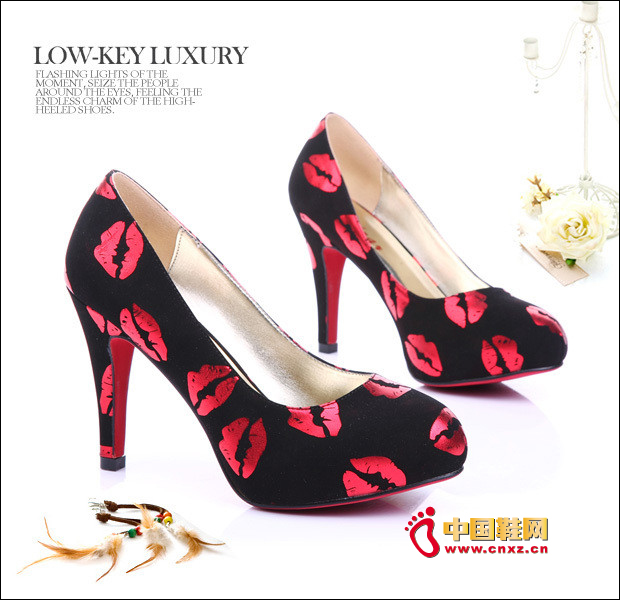 紅唇微張,是若有似無的性感挑逗。這款高跟女單鞋,采用進口柔軟質感的絨料,突顯出女性的溫柔,布滿唇印的設計,更是讓女性的誘惑發揮到極致,只一眼,就讓你從此沉淪在足下