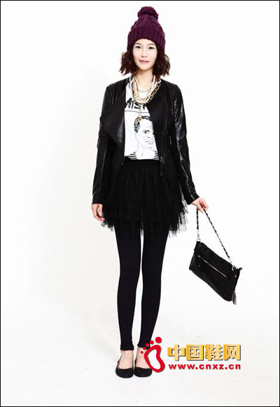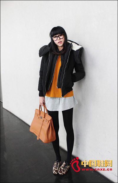 外套的雙拉鏈設(shè)計(jì),增加了穿衣層次,還搭配了豹紋的平底鞋,很有酷感