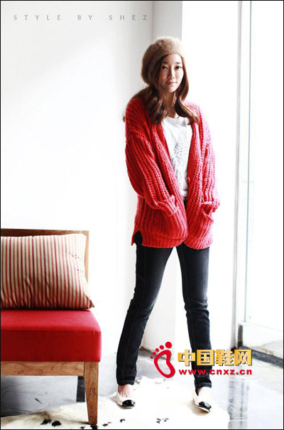 番茄紅的針織外套搭配拼接的平底鞋,透著少女般得可愛(ài)味道