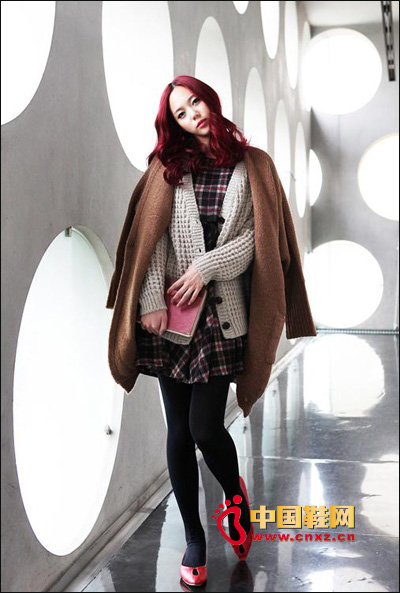 清麗的格紋短裙,混搭毛衣、外套和紅色平底鞋,時(shí)尚指數(shù)飆升