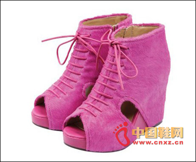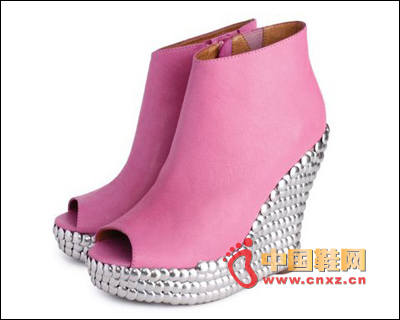 中國鞋網6月29日訊,粉色系列絕對是粉紅妹妹的最愛!其中一雙魚嘴窩釘坡跟踝靴相比其它幾雙更具特色,魚嘴涼鞋加上鋪滿窩釘?shù)男,讓整雙鞋在甜美的基礎上多了些搖滾范兒,更有個性。