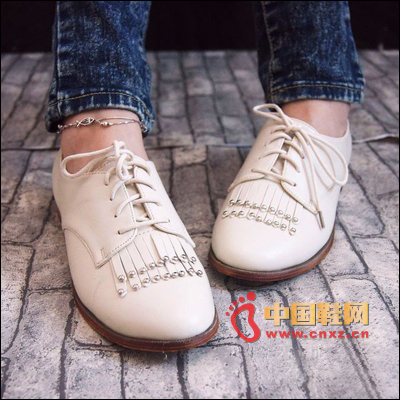 流蘇上帶串珠,白色軟皮的鞋面,交叉綁帶的平底單鞋,帶來一點休閑的味道