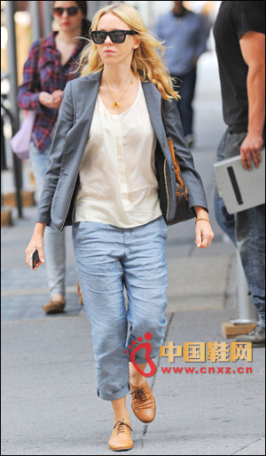 中國鞋網10月28日訊,當下的潮流真是有點怪,MM們都爭著拿男友的白襯衫、牛仔褲穿,F在這股風潮被明星們延伸到了鞋子上,高跟鞋不再搶眼,平底的芭蕾鞋太過普通,男式系帶皮鞋開始出現在了她們的腳上。你還等什么?女人穿牛津鞋是一件非常mutual的事情,最近看見很多女生瘋狂的愛上牛津鞋,非常之帥氣就像女人穿男人西裝一樣別有一番韻味。牛津鞋成為時下百搭鞋履之王,你可以搭配學院風的服裝,也可以搭配英式龐克搖滾衣服,只要你想那就隨心搭配吧!