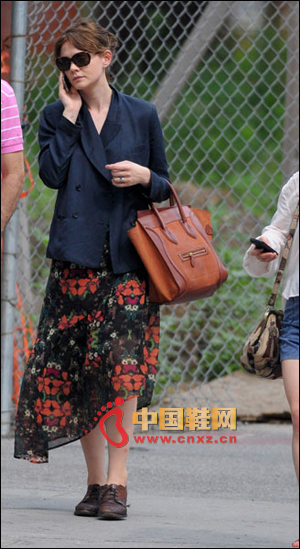 藏青色的雙排扣西裝格外大氣,內搭碎花斜裁下擺裙又把她女性的那份柔美刻畫的淋漓盡致,可謂是恰到好處。土紅色的包包與碎花形成了呼應,而深色的牛津系帶鞋又讓整身的層次感豐富了許多,真是讓人稱贊啊