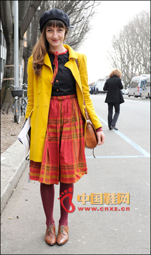質感超棒的黃色毛呢大衣內搭紅色半身裙,真是很不錯的搭配組合,格子的花紋顯得大氣十足,又與深色的絲襪產生了撞色效果,牛皮質感的挎包與漂亮的牛津鞋在色彩上產生了相呼應的效果。