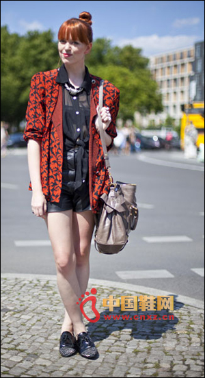 黑色與紅色的搭配一直是一個經典的搭配色,棗紅色的印花休閑西裝大氣十足,內搭薄紗透明襯衣,又讓你獨具女人的魅力,高腰短褲會顯得你的腿特別的修長哦。不得不提的就是這雙牛津鞋了,鑲鉆的處理手法,總會吸引欣賞者的眼球,算是這身搭配中的點睛之筆吧。