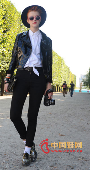 黑色的漆皮夾克搭基本款的白色襯衫,隨意又對比分明,系腰的處理彰顯出穿著者對著裝的獨特品味,黑色的窄腿褲會顯得你的特別纖細哦,金屬色的牛津皮鞋讓這身復古裝多了點朋克的味道,很是美妙啊。