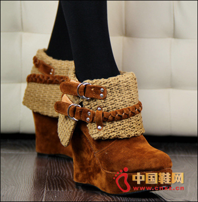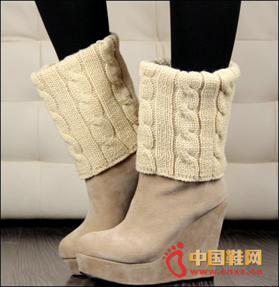 2011冬新款韓版高跟坡跟絨面拼毛線筒中筒靴毛線靴,超夸張的粗高跟,大圓頭的運用,要訴說的是一種狂野的內(nèi)心向往,深靜時是一種對無古氣息的懷念,毛邊的修飾,多了溫暖感和俏皮感,穿這樣一款靴,搭配牛仔破洞褲,牛仔背心,現(xiàn)代都市的時尚MM是否已經(jīng)回到了那原古?