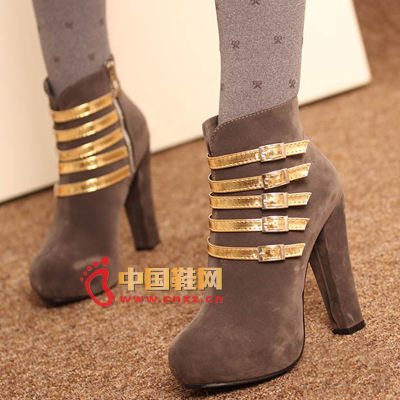 個性拼色搭扣內增防水臺粗跟踝靴,時尚的金色搭扣設計,超帥氣,性感又百搭哦!
