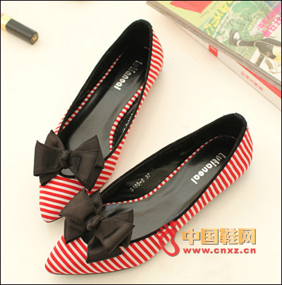 低跟單鞋,清新的條紋鞋身彰顯女性的個性,秀氣的尖頭,大大織帶蝴蝶結點綴將女生的甜美推到極致,平跟設計,舒適的同時彰顯女生的俏皮氣息。