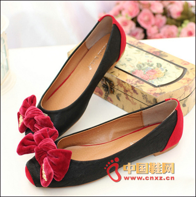蝴蝶結平跟單鞋,優質柔軟的絨面質地,紅與黑的經典拼色,扭結式的蝴蝶結點綴,完美展現女生的可愛迷人大方的氣質。
