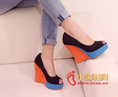 顏色很洋氣的坡跟單鞋,鞋型很包腳,厚厚的坡跟但是穿起來不會顯得笨重,彩色的鞋面搭配撞色的鞋跟色彩 實在很好看,今夏必須擁有一雙撞色的鞋子。