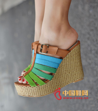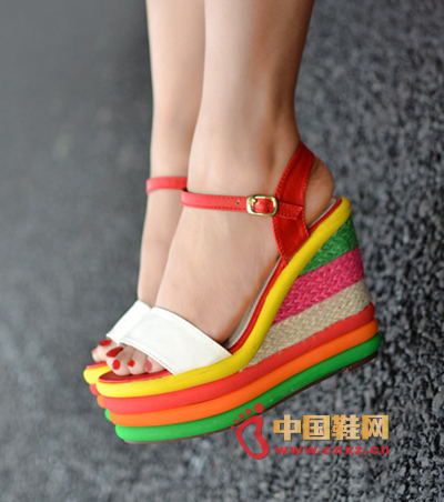 彩虹底的坡跟涼鞋,撞色的一字帶,很完美的時尚組合,穿在腳上會有很搶眼的效果,想要高坡跟的MM一定不要錯過的美鞋。