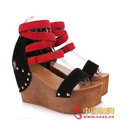 拼色搭配環繞腳踝,鉚釘單系帶,超厚坡跟歐美風情。
