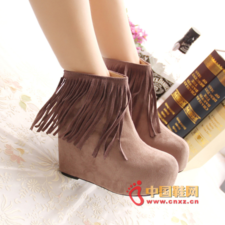 小圓頭的內(nèi)增高坡跟短靴,配上腳裸的流蘇,更有動感。