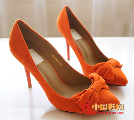 淺口尖頭高跟鞋,展現(xiàn)優(yōu)雅的女人味,蝴蝶結(jié)的裝飾和亮麗的橙色設(shè)計,給這雙高跟鞋增添了一份俏麗的感覺。