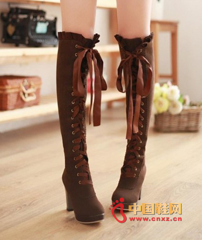這一款長靴超級搶眼,特別有型,系帶棕色高跟長靴,稍微緊一緊,整個小腿更是修長纖細,打破拉鏈或者直套長靴款。花邊和蝴蝶結的系帶也增添了很多美感。