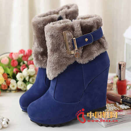 寶石藍色的精美小短靴,鮮艷靚麗的色彩,給人以非常迷人的時尚氣息,精美的小坡跟,穿著起來非常的舒適,淡灰色的皮草搭配,體現出非常溫馨的時尚質感。