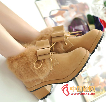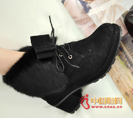 蝴蝶結兔毛翻領中跟粗跟短靴,飽滿的靴頭,很是干凈大方,粗跟,上腳非常的穩重,特別設計的二穿法,靴口處是兔毛毛與大大蝴蝶結的結合,甜美俏皮,時尚百搭款。