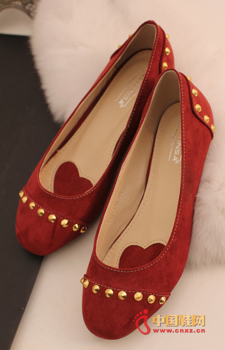 韓版平底單鞋,鮮艷的色彩,超級(jí)的惹眼,鞋面與后跟都有鉚釘裝飾,酷感十足。