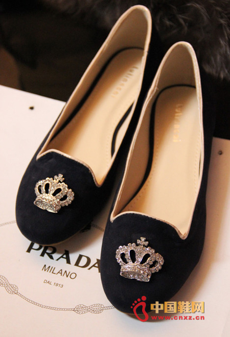 絨面圓頭平底鞋,一抹亮麗的金色包邊,看起來更閃亮,皇冠的點綴個性又可愛。