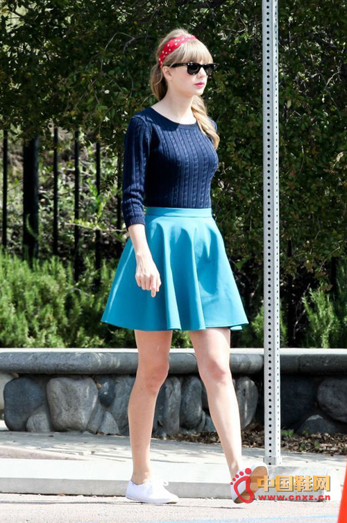 今年風頭最勁的黑白條紋針織衫搭配小腳九分褲,腳上再來一雙小紅鞋,舒適又時髦的少女裝就完成了,如果希望風格再強烈一點的話也可以像泰勒一樣涂上紅唇和猩紅指甲油。