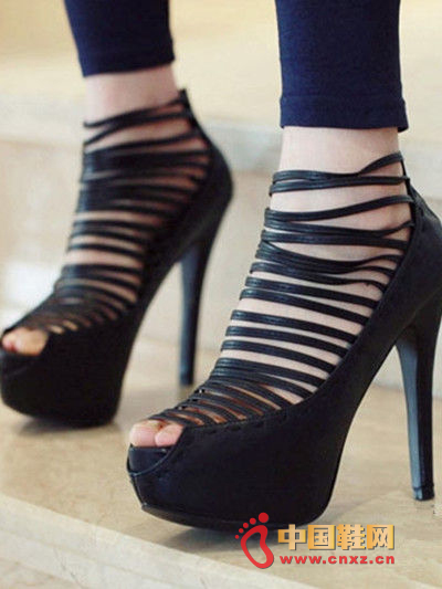 這款魚嘴高跟鞋子,更是有設計。鞋面全都是綁帶設計,直到腳踝處,顯得腳步線條特別美。搭配小腳牛仔褲,穿出修長美腿。