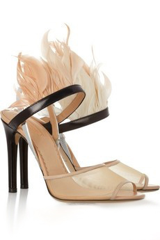 Reed Krakoff 這款淺粉色網布和皮革涼鞋出自秀臺系列,絕對令人過目不忘。柔滑的淺色羽毛和銀色露跟鞋帶營造出最強烈的視覺沖擊力。建議搭配高擺裙裝,秀出古銅色美腿,盡情展現這雙鞋的耀眼魅力。