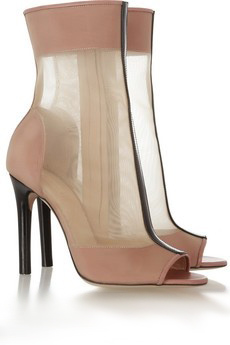 透視配飾在今春搶盡了風頭。ReedKrakoff 這款及踝靴將古典玫瑰色和黑色皮革與裸色網眼面料完美融合。建議用這一走秀款搭配短裙。