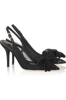 Dolce &Gabbana的尖頭露跟鞋采用黑色蕾絲精心制作而成,鞋面裝飾超大蝴蝶結,完美演繹了意大利設計師二人組的經典浪漫風格。用它搭配印花外套和緊身牛仔褲,展現最具摩登氣息的美學理念。