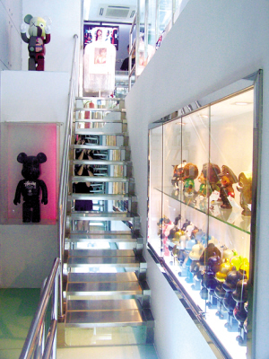 店主之一阿鋒本身就是80后,自己非常喜歡波鞋,畢業(yè)后干脆就同來自香港的拍檔合伙開店,不知不覺原來已經(jīng)開店兩年。路上的店門小得跟住宅樓的門一樣,可店里有很多Be@rbrick的熊仔公仔,從一樓、夾層的樓梯邊上夾道歡迎你。不過不要對它們產(chǎn)生非分之想———它們是店主們的珍藏,非賣品。