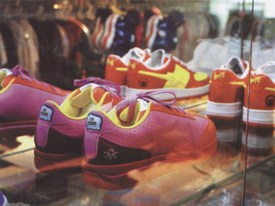 剛到 CHEESE的店門口便會(huì)看見(jiàn)BSPe出的一只叫milo的可愛(ài)猴子豎立在那。再往里看會(huì)發(fā)現(xiàn)很多不同顏色的熊站成一排,老板說(shuō)熊有很多名字。而品牌說(shuō)起來(lái)也很復(fù)雜不是一會(huì)工夫能說(shuō)清楚的,這不由的讓人覺(jué)得來(lái)到7動(dòng)物園。CHEESE的所有商品都和店面陳設(shè)一樣簡(jiǎn)潔大方,有很多的個(gè)性圖案不恤和亮麗色彩的潮鞋擺放得十分整齊。寬敞的2條通道讓顧客有足夠的空間看清商品。而 CHEESE的老板還是一個(gè)學(xué)生。目前在英國(guó)的一所藝術(shù)學(xué)院就讀,開(kāi)這家店子起初是因?yàn)樘貏e喜歡日本風(fēng)格的東西。所以店里的所有商品都是從日本進(jìn)口的。商品主要以男士鞋子和衣服為主。女士的只有一小部分。店內(nèi)的鞋子大多是NIKE.NewBalance和 Addias等。其中最讓老板引以為豪的是一雙是白色的NIKE球鞋這可是非賣品,因?yàn)樗抢习逵H自挑選皮料后由NIKE特別定做的,可謂是鎮(zhèn)店之寶了。其余的商品中也不乏各種品牌的限量款式這無(wú)疑是吸引眼球的最佳武器。所以CHEESE必能成為時(shí)尚潮人的新寵。