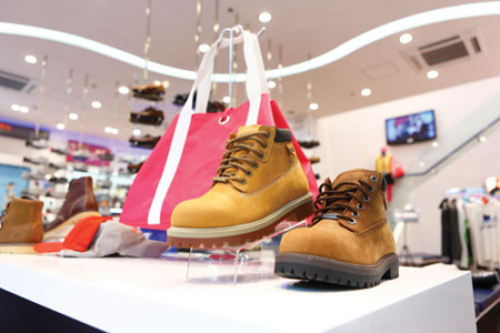 新店上下兩個樓層,格局十分開闊,店鋪中央是個呈弧線型的玻璃架,擺放著主打的新款板鞋,左則貨架上的靴子則是女士們的最愛。作為一個綜合性的店鋪,店內一角還有非常活潑俏皮的童鞋出售,而品牌旗下的休閑服飾、帽子、包包等配飾則主要在二樓。