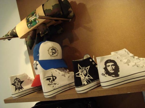 Shirtflag衫旗幟的創辦者大家一定不陌生,他就是上海著名的平面設計師吉吉。碩大的紅五星logo、以“文革”為主題的政治波普圖案是衫旗幟的標志。單是那店里醒目的正紅色五星標志,就讓人為之一振。店內的服飾設計大膽另類,大多出自老板吉吉之手。生于上世紀70年代的他,對于那個年代有種獨特的情愫,例如黨徽、工農兵、切•格瓦納等等。他的設計充滿活力,不生硬、也不教條,他用一些街頭文化的符號消解了政治氣息,將兩個截然不同的年代相融合,如健壯的工農兵舉著的不再是紅寶書,而是一塊滑板;包著花頭巾的社員也可以甜蜜地接吻。在這里,除了可以買到老板的精心設計以外,還能覓到不少寶貝:搞怪的玩偶、先鋒的書籍、有趣的筆記本,無一不是名家的作品。單品推薦:①漆皮挎包價格:480元